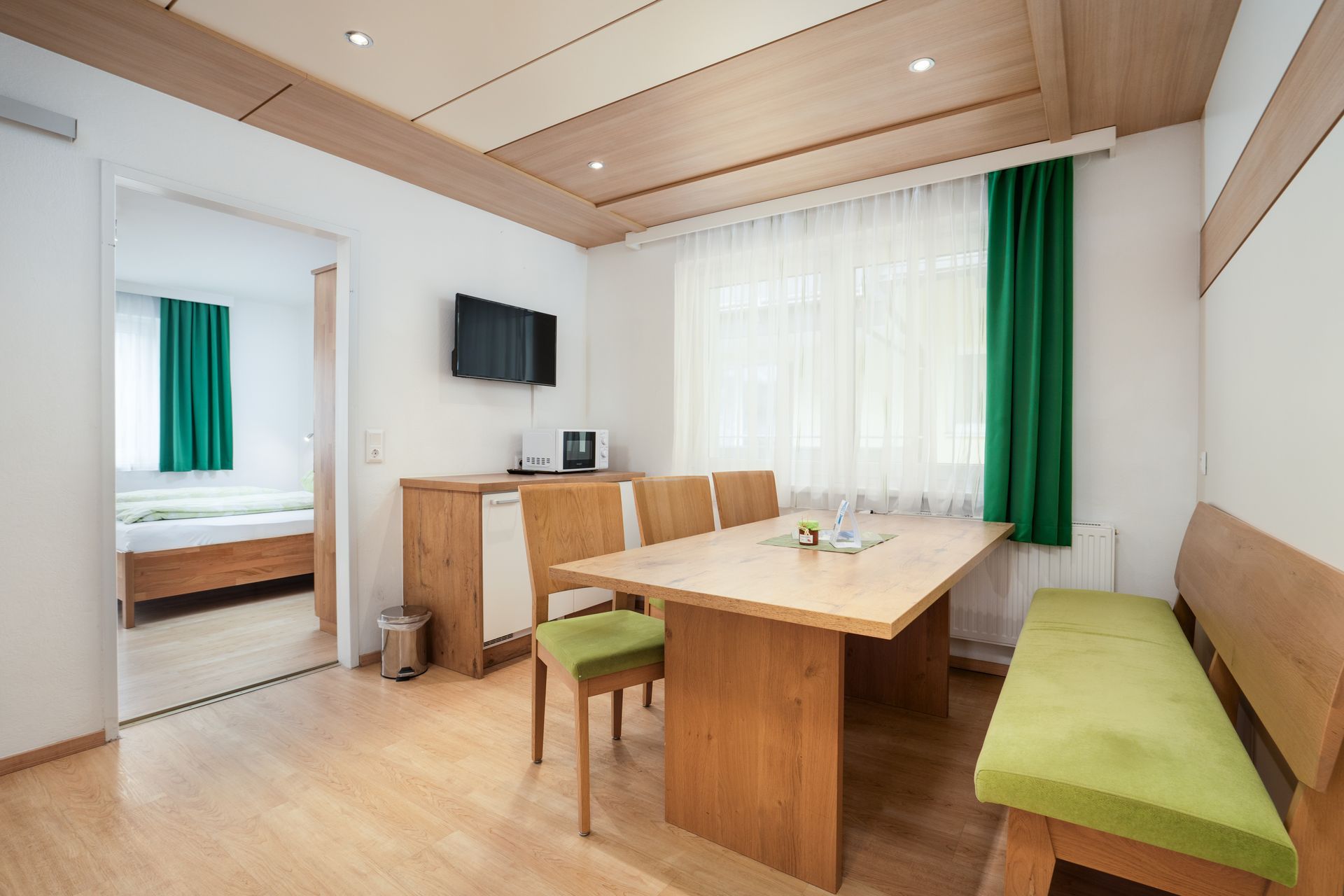 Unser Apartment TOP 9 befindet sich im 2. Stockwerk. Zwei separate Schlafzimmer sind jeweils mit einem Doppelbett und einem Einzelbett ausgestattet – ideal für Familien oder kleine Gruppen. Die vollausgestattete Küche, kostenfreies WLAN, Kabel-TV und einem Lift im Haus sind entspannte, autofreie Urlaubstage garantiert – im Sommer wie im Winter.