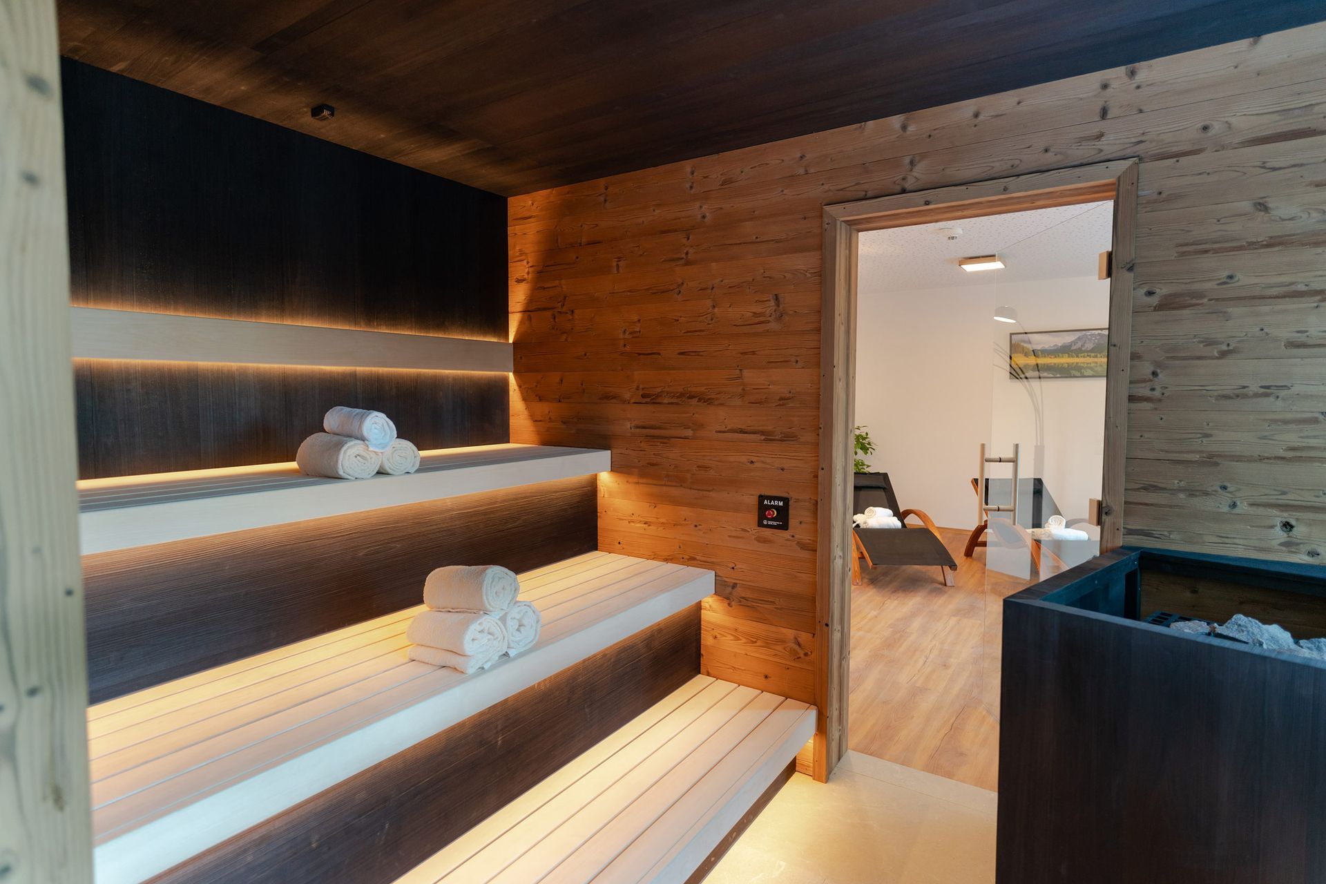 Zusätzlichen Komfort bietet die Wohlfühloase im Untergeschoß des Apartmenthotels: