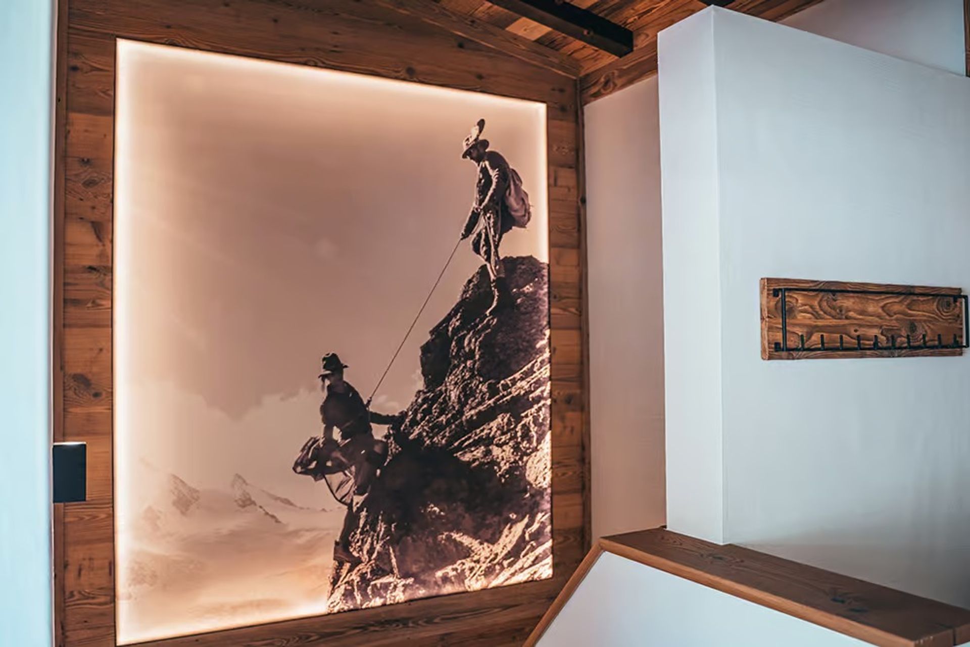 Hochwertige Materialien wie Holz, Stein und hinterleuchtete Kunstmotive schaffen eine warme, stilvolle Atmosphäre. Die zwei Bäder verfügen über großzügige Regenduschen.