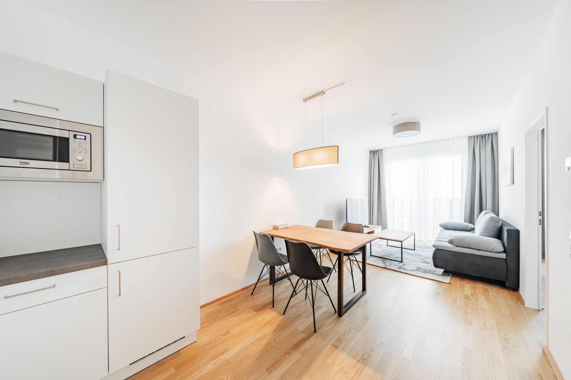Sie besteht aus Vorraum, Bad mit WC, Abstellraum, Wohnküche, Schlafzimmer und Balkon. Die Wohnung ist komplett und modern möbliert: Einbauküche (Miele-Geräte!) inklusive Küchenutensilien und Geschirr, Waschmaschine im Bad mit Badewanne, Flachbildfernseher, Highspeed-Internet, Fußbodenheizung statt Klimaanlage.