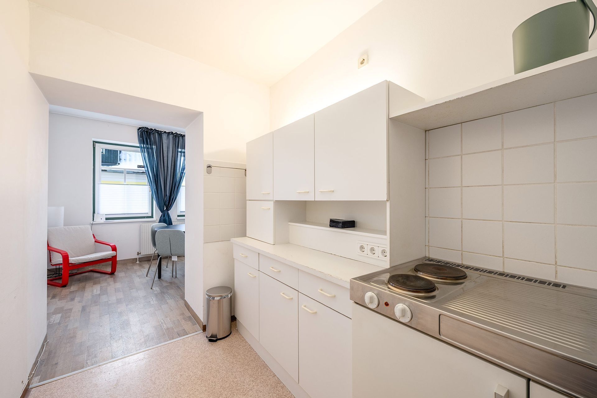 Auf 33 m² im 1. Stock bietet das Apartment ein komfortables 180 cm Doppelbett, WLAN, ein Badezimmer mit separater Toilette sowie eine funktionale Küche mit allem, was man für einen kurzen Aufenthalt benötigt.